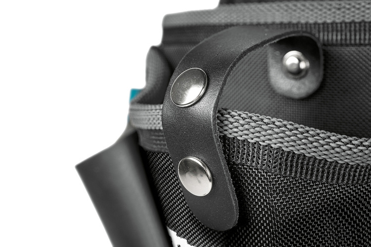 • Oprócz wielu kieszeni i pasków, kabura na wiertarkę posiada uchwyt do przenoszenia oraz uchwyt na miarkę ze stali nierdzewnej.